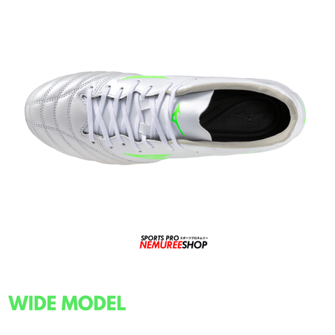 The MIZUNO MONARCIDA NEO 3 WIDE PRO in White/Neon Green is designed to elevate your game with superior comfort and performance. This wide model features a durable microfiber synthetic upper and an ultra-light outsole with a reinforced shank for enhanced stability. Inspired by the MORELIA NEO series, it offers an engineered fit and redesigned laces eyelet structure to reduce creasing and improve foot conformity. Lightweight at about 190 grams, it suits all ground types with round, larger studs and includes a replaceable ZERO GLIDE insole for exceptional grip. Made in Vietnam, this boot delivers lasting durability on every field.